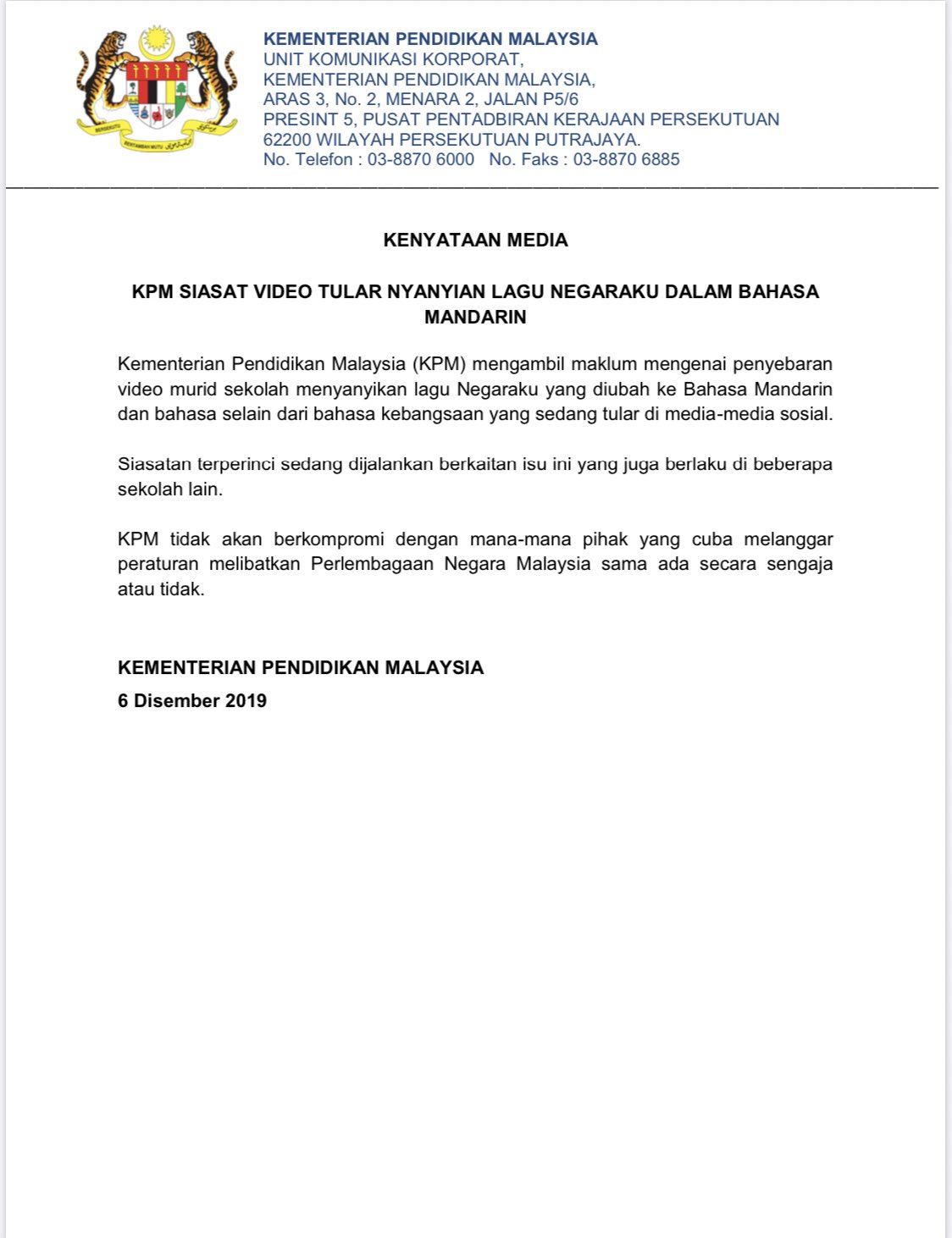 Kpm On Twitter Kenyataan Media Kpm Siasat Video Tular Nyanyian Lagu Negaraku Dalam Bahasa Mandarin Https T Co Jh8s71tpeg Twitter